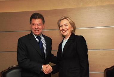 | Keywords: Santos and Clinton.jpg U S Secretary of State Hillary Rodham Clinton shakes hands with Colombian Presidential Candidate Juan Manuel Santos to discuss issues of bilateral interest at the Hotel Charleston in Bogotá Colombia on June 9 2010 State Department photo/ Public Domain http //www flickr com/photos/statephotos/4685080969/ Secretary Clinton Shakes Hands With Colombian Presidential Candidate Juan Manuel Santos 2010-06-09 10 41 http //www flickr com/photos/9364837 N06 U S Department of State from United States 4 667451 -74 09317 source Flickr PD-USGov-POTUS U S Department of State http //flickr com/photos/9364837 N06/4685080969 09 15 25 September 2010 UTC United States Government Work PD-USGov Juan Manuel Santos with national leaders Hillary Rodham Clinton in 2010 Relations of Colombia and the United States |