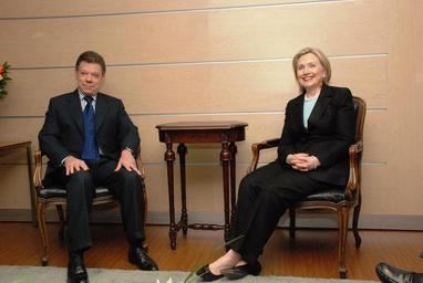 | Keywords: Santos Clinton.jpg en U S Secretary of State Hillary Rodham Clinton meets with Colombian Presidential Candidate Juan Manuel Santos to discuss issues of bilateral interest at the Hotel Charleston in Bogotá Colombia on June 9 2010 State Department photo/ Public Domain http //www flickr com/photos/statephotos/4685081339/in/pool-public State Department photo/ Public Domain 2010-06-09 Santos Clinton-2 jpg Relations of Colombia and the United States Juan Manuel Santos with national leaders Hillary Rodham Clinton in 2010 PD-USGov |
