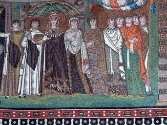 | Keywords: SanVitale12.jpg Byzantine mosaic in Basilica of San Vitale Ravenna depicting Empress Theodora 6th century flanked by a chaplain and a court lady believed to be her confidant Antonina wife of general Belisarius Dettaglio da L'imperatrice Teodora e la sua corte Dai mosaici del coro di San Vitale a Ravenna Eseguito entro l'anno 547 own 2006-04-05 Georges Jansoone PD-Art GFDL Cc-by-sa-3 0-migrated Cc-by-2 5 San Vitale Ravenna - Mosaic of Theodora Byzantine eunuchs | ||||