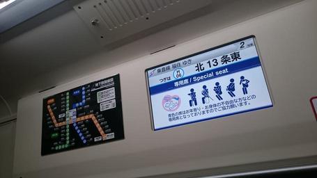| Keywords: Sapporo 9000 LCD display (2) 20150513.JPG en An LCD passenger information display inside Sapporo Municipal Subway 9000 series EMU set 9101 ja æ å¹Œå¸‚å–¶å °ä¸‹é‰„9000å½¢LCD 2015-05-13 18 31 05 ja File Toho9000-lcd JPG Uploaded 2015-05-15 ja User Ssb-519 other versions Custom license marker 2015 05 15 Ssb-519 ja Sapporo Municipal Subway 9000 series May 2015 in rail transport in Japan Uploaded with UploadWizard Liquid crystal displays in trains in Japan Photographs taken on 2015-05-13 Taken with Sony Xperia Z3 Compact |