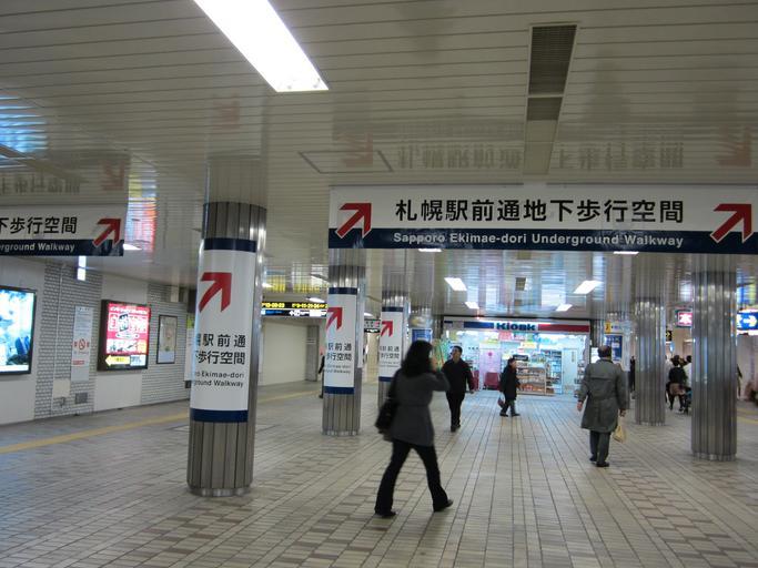 Keywords: Sapporo sta south dir.jpg ja さっぽろ駅南北線側から 下歩行空間に向かう 中 ここから左側に行くと 豊線への 絡 路に阻まれ歩行空間にたどり けない 2012-04-24 own Ninosan cc-zero Sapporo Station Sapporo Municipal Subway Uploaded with UploadWizard