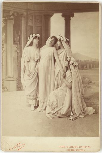 Keywords: Sarah Bernhardt as Phedre in Racine's Phaedra.jpg Introduced in the 1860s cabinet cards were studio-produced photographs mounted on cardstock Inexpensive multiples offered for public sale they often featured portraits of celebrities of the day “writers musicians actors “and were widely collected Nadar's photograph of Sarah Bernhardt French 1844-1923 as Phèdre is from a collector's album of cabinet card portraits of Bernhardt by various photographers A famous actress in the late 1800s the Divine Sarah was a brilliant self-promoter at a time when the basis of celebrity was shifting from the political figure to the theatrical performer Bernhardt pioneered the use of new technologies to disseminate her image she was one of the most photographed women in the world and the first major stage actress to star in films She made several recordings of famous theatrical dialogues including a reading from Racine's Phèdre at Thomas Edison's home A recognizable figure Bernhardt “often depicted in theatrical costume “endorsed commercial products Contemporary with this cabinet card her image appeared on cigarette cards an early form of product promotion Advertisements as well as collectable ephemera cigarette cards like cabinet cards reinforced Bernhardt's image in popular culture ~ 1874 Albumen silver print 14 6 x 11 4 cm 5 3/4 x 4 1/2 in Institution Getty Center object history exhibition history other versions 62674 credit line accession number 87 XA 71 8 PD-100 Photographs of Sarah Bernhardt by Nadar Phèdre Racine 1874 in Paris 1874 photographs Photographs in the Getty Museum Theatrical costume in portraits 1874 in theatre |