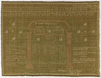 | Keywords: Sarah A. Chalker - Family register sampler - Google Art Project.jpg 1819 1879 Sarah 4175001 A Chalker 1819 - 1879 /collection/cooper-hewitt-national-design-museum/artwork/family-register-sampler-sarah-a-chalker/6715387/ 75353 Sarah A Chalker /artist/sarah-a-chalker/6826669/ 6826669 /collection/cooper-hewitt-national-design-museum/ Cooper-Hewitt National Design Museum 3644669 http //www cooperhewitt org/ /collection/cooper-hewitt-national-design-museum/artwork/family-register-sampler-sarah-a-chalker/6715387/ 1832 1832 Medium silk embroidery on wool foundationTechnique embroidered in cross stitch on plain weave foundation By 1941 Mrs Henry E Coe Eva Johnston Coe 1941 Museum for the Arts of Decoration of the Cooper Union 430 6715387 False 1832 1941-69-43 http //collection cooperhewitt org/view/objects/asitem/id/75353 Bequest of Mrs Henry E Coe Family register sampler 1830 1840 w560 x h430 cm 1832 False 1 3027989821883 Object family-register-sampler-sarah-a-chalker Family register sampler f 560 H x W 43 x 56 cm 16 15/16 x 22 1/16 in New York NY Cooper-Hewitt Museum Stitched in Time May 14 - July 18 1969 Wrought by Sarah A Chalker Aged 13 1832 Medium silk embroidery on wool foundationTechnique embroidered in cross stitch on plain weave foundation By 1941 Mrs Henry E Coe Eva Johnston Coe 1941 Museum for the Arts of Decoration of the Cooper Union special url_id uwGW-rX8IXQCxg PD-old-100-1923 1879 Google Art Project works by Sarah A Chalker Textiles in the Cooper “Hewitt Smithsonian Design Museum 1830s samplers Google Art Project works in Cooper-Hewitt Smithsonian Design Museum 1832 works |