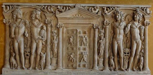 | Keywords: Sarcophagus four seasons Musei Capitolini MC1185.jpg Front panel of a sarcophagus representing the four seasons Roman Imperial artwork Panneau avant d'un sarcophage représentant les quatre saisons œuvre romaine de l'époque impériale Fronte di sarcofago con le quattro stagioni opera romana di età imperiale ca 250 AD marble cm 104 239 Institution Musei Capitolini Palazzo dei Conservatori Hall of the Triumphs object history credit line accession number MC 1185 own photo date 2006 Marie-Lan Nguyen artwork license PD-old-100 photo license other versions Reliefs of allegories of all seasons 3rd-century sarcophagi in Italy Rome Stone reliefs of nude men Ancient Roman sarcophagi in the Musei Capitolini Doors in art Sculptures of Greek and Roman theater masks Seasons Sarcophagus Greek and Roman theater masks in 3rd century AD Seasons Sarcophagus Boars in art Ancient Roman doors in Italy Rome Reliefs of putti in Rome Ancient Roman reliefs of putti |