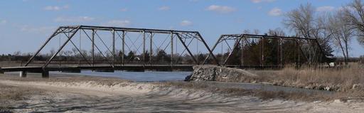 | Keywords: Sargent bridge from SE 2.JPG Sargent Bridge across the Middle Loup River south of Sargent Nebraska ; seen from the southeast downstream The Pratt through truss bridge was built in 1908 and is listed in the National Register of Historic Places It is no longer used for vehicle traffic a new bridge located downstream from the old one now carries U S Highway 183 across the river The bridge is at the head of a small island in midstream; in the picture the left truss crosses the channel south of the island while the right truss crosses the channel to the north own Ammodramus 2010-03-25 Pictures by Ammodramus Taken with Panasonic Lumix DMC-FZ20 Sargent Bridge |