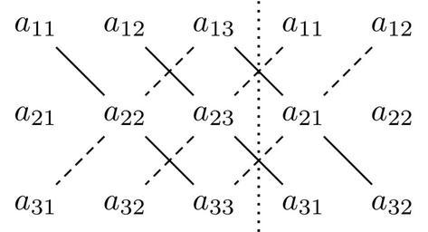 | Keywords: Sarrus rule.svg en Illustration of Sarrus' rule 2012-07-15 own icktoofay Vectorized version of File Sarrus rule png Generated with TikZ and <span class texhtml ><span style font-family cmr10 LMRoman10-Regular Times serif; >L<span style text-transform uppercase; font-size 70 ; margin-left -0 36em; vertical-align 0 3em; line-height 0; margin-right -0 15em; >a</span>T<span style text-transform uppercase; margin-left -0 1667em; vertical-align -0 5ex; line-height 0; margin-right -0 125em; >e</span>X</span></span> Source code <source lang latex > \documentclass minimal \usepackagepapersize 4 8cm 2 6cm margin 0cm geometry \usepackage tikz \pagestyle empty \begin document \raggedright \begin tikzpicture semithick \clip -0 4 -0 3 rectangle 4 4 2 3 ; \foreach \vert in 1 2 3 \foreach \horz/\hnum in 1/1 2/2 3/3 4/1 5/2 \node a\vert-\horz at \horz - 1 3 - \vert a_ \vert\hnum ; \draw a1-1 -- a2-2 a2-2 -- a3-3 a1-2 -- a2-3 a2-3 -- a3-4 a1-3 -- a2-4 a2-4 -- a3-5 ; \draw densely dashed a1-3 -- a2-2 a2-2 -- a3-1 a1-4 -- a2-3 a2-3 -- a3-2 a1-5 -- a2-4 a2-4 -- a3-3 ; \draw thick dotted 2 5 -0 3 -- 2 5 2 3 ; \end tikzpicture \end document </source> cc-zero Uploaded with UploadWizard Sarrus rule Images with LaTeX source code |