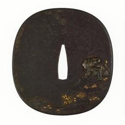 | Keywords: Sasayama Tokuoki - Tsuba with a Tiger on a Cliff - Walters 51146.jpg On the right side of this tsuba a tiger is perched on a cliff While tigers are not native to Japan they have long been known through Chinese painting The tiger is often a symbol of strength The reverse of this tsuba shows two pine trees under a gibbous moon between 1813 1896 late Edo-Meiji iron shibuichi gold silver shakudo cm 8 35 7 88 0 45 accession number 51 146 1378 Henry Walters Baltimore date and mode of acquisition unknown Walters Art Museum Henry Walters Acquired by Henry Walters Signature Ikkôsai Tokuoki place of origin Kyoto Japan Walters Art Museum license Tsuba in the Walters Art Museum Sasayama Tokuoki Media contributed by the Walters Art Museum needs category review |