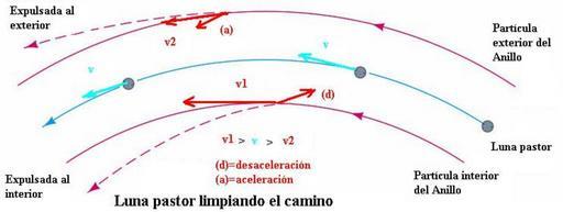 | Keywords: Sat pastor.jpg see below own work 2005-09-06 original upload date User Xgarciaf technology Convert to international Notes El satélite pastor acelera a la partícula exterior que sube a una órbita superior y frena a la interior que baja a una órbita más baja Se abre así un camino cuya anchura depende de la masa del satélite pastor Como un satélite pastor limpia una franja de anillo Supongamos dos partículas representativas en órbita alrededor de un planeta una interior a un satélite pastor y otra exterior a dicho satélite Según las leyes físicas la partícula interior se mueve más rápidamente que el pequeño satélite que a su vez lo hace más deprisa que la partícula exterior Así al pequeño satélite está adelantando a la partícula interior al tiempo que él rebasa a la partícula exterior Cada partícula es atraída hacia el satélite pastor por la acción gravitatoria de éste; de ahí que la partícula interior es frenada por el satélite pastor mientras la exterior es acelerada por el satélite pastor El tirón gravitatorio neto que el satélite ejerce sobre la partícula exterior tiene la dirección del movimiento orbital de esta partícula que pasa así a una órbita más alta A la inversa el tirón que el pequeño satélite ejerce sobre la partícula interior se opone a la dirección del movimiento orbital y esta partícula cae a una órbita más baja En definitiva el pequeño satélite limpia una banda a uno y otro lado de su trayectoria Cuanto mayor sea la masa del satélite más ancha será la banda Saturn planet |