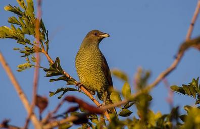 Keywords: satin bowerbird bird ptilonorhynchus violaceus female green speckled blue eyes wild native queensland australia blue sky