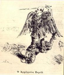 | Keywords: Satyra Charilaos Trikoupis.jpg en Greek satirical caricature of Charilaos Trikoupis 1882 as the Archangel Chariel ready to strike down his political rival Alexandros Koumoundouros el Ο Χαρίλαος Τρικού ης σαν αρχάγγελος σε γελοιογραφία της ε οχής ετοιμάζεται να σκοτώσει τον ολιτικό του αντί αλο Αλεξ Κουμουνδούρο Ιστορία του Ελληνικού Έθνους Εκδοτική Αθηνών Αθήνα 1978 ISBN 960-213-110-1 σελ 15 author 1882 δείτε αρακάτω α ό Γεννάδειος Βιβλιοθήκη Αθήνα PD-old 1882 in Greece Charilaos Trikoupis Caricatures of politicians of Greece Trikoupis Charilaos 1882 cartoons Alexandros Koumoundouros |