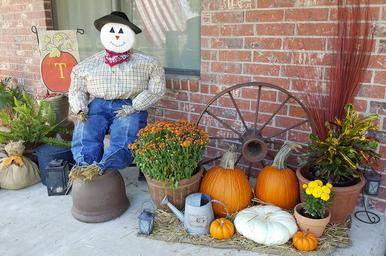 Keywords: scarecrow fall autumn pumpkin decoration orange curb appeal