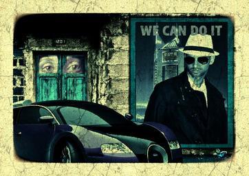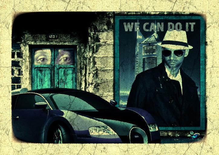 Keywords: scene frame cracks home facade poster man auto sports car blue wall door masonry stones building loneliness hue gloomy advertising negative
