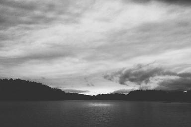 Keywords: scene water lake sea ocean coast shore hills forest trees sky clouds nature landscape tranquil peaceful horizon weather black and white