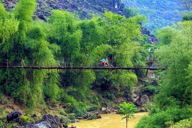 Keywords: scenery suspension bridge tre streams people motorcycle ha giang vietnam