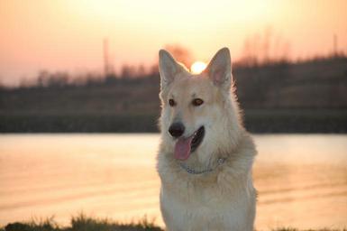 Keywords: schäfer dog dog sled dog water sunset hybrid