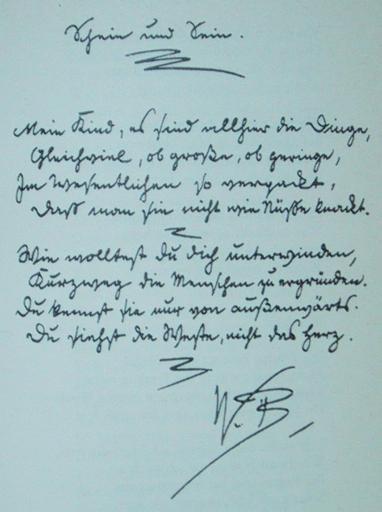| Keywords: Schein und Sein.jpg s de Schein und Sein Ein Wilhelm-Busch-Text in handschriftlicher deutscher Kurrentschrift A text of Wilhelm Busch in German Kurrent 和心 威廉·布施 < 1909 Creator Wilhelm Busch German Wikipedia other fields 1 Transcription inscription Schein und Sein Mein Kind es ſind allhier die Dinge <br> Gleichviel ob große ob geringe <br> Im Weſentlichen ſo verpackt <br> Daſs man ſie nicht wie Nüſse knackt <br> Wie wollteſt du dich unterwinden <br> Kurzweg die Menſchen zu ergründen <br> Du kennſt ſie nur von außenwärts <br> Du ſiehſt die Weſte nicht das Herz <br> W B de other fields Translation Appearance and Being My child there are all things<br /> regardless if major or minor<br /> for the most part packaged thus<br /> that one cannot crack them like nuts in German cracking a nut can refer to solving a problem <br /> How would you take on such a thing<br /> to quickly fathom people<br /> You only know them from the outside<br /> you see the vest not the heart <br /> 和心 小孩子, 很多事,<br /> 无论大或小,<br /> 如 子打不 <br /> 它们的硬皮 <br /> 你 么要<br /> 快快认识人?<br /> 你只见他们外边<br /> 你知衫不知心 PD-old Original upload log 23 56 15 Jan 2005 Mijobe Diskussion Beiträge 582 x 780 69 422 Byte German Kurrent Poems in German Wilhelm Busch Long s |