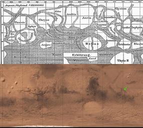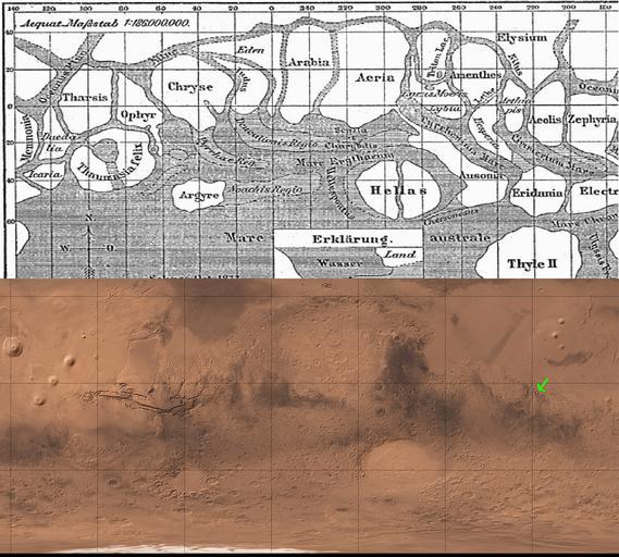 | Keywords: Schiaparelli versus Mars.jpg Comparison of Schiaparelli's 1888 map of Mars File Karte Mars Schiaparelli MKL1888 png with a modern satellite map File Mars Géolocalisation jpg As was previously commented for Pioneer data <sup>http //www agu org/pubs/crossref/1974/JB079i026p03907 shtml</sup> there is a limited but meaningful degree of accuracy apparent in the old map The location of Gale Crater landing site of the Curiosity rover whose features have since been named Aeolis Mons and Aeolis Palus after Schiaparelli's name for the feature is noted with the green arrow Schiaparelli portion is PD-Meyers ; NASA license below PD-USGov-NASA Old maps of Mars Comparisons |