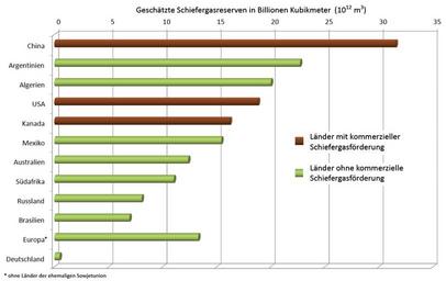 | Keywords: Schiefergasreserven 2013.png en Bar chart showing the global top ten countries ranked by amount of unproved technically recoverable wet shale gas resources plus Europe and Germany created by means of MS Excel 2007 using data from EIA 2013 <ref name EIA2013 >U S Energy Information Administration 2013 Technically Recoverable Shale Oil and Shale Gas Resources An Assessment of 137 Shale Formations in 41 Countries Outside the United States U S Department of Energy Washington DC https //www eia gov/analysis/studies/worldshalegas/archive/2013/pdf/fullreport_2013 pdf PDF 65 MB table 3 p 6 therein</ref> and Liu et al 2015 <ref name Liu_et_al_2015 >Pingli Liu Yinsheng Feng Liqiang Zhao Nianyin Li Zhifeng Luo 2015 Technical status and challenges of shale gas development in Sichuan Basin China Petroleum 1 1 1 “7 doi 10 1016/j petlm 2015 03 001 Open Access fig 1 p 2 therein </ref> de Balkendiagramm mit Auflistung der zehn Länder mit den weltweit größten Schiefergasreserven geschätzte technisch förderbare Ressourcen von nassem Schiefergas zuzüglich Europa und Deutschland erstellt mittels MS Excel 2007 nach Daten aus EIA 2013 <ref name EIA2013 /> und Liu et al 2015 <ref name Liu_et_al_2015 /> <references /> own Gretarsson 2016-07-25 Shale gas Economic bar charts Cc-zero |