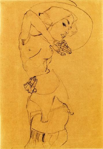View Original:schiele_standing_nude_with_large_hat_gertrude_schiele_1910.jpg (710x1018)