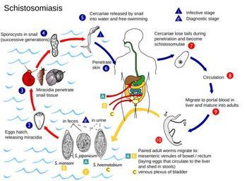 | Keywords: Schistosoma life cycle.svg en Eggs are eliminated with feces or urine 1 Under optimal conditions the eggs hatch and release miracidia 2 which swim and penetrate specific snail intermediate hosts 3 The stages in the snail include 2 generations of sporocysts 4 and the production of cercariae 5 Upon release from the snail the infective cercariae swim penetrate the skin of the human host 6 and shed their forked tail becoming schistosomulae 7 The schistosomulae migrate through several tissues and stages to their residence in the veins 8 9 Adult worms in humans reside in the mesenteric venules in various locations which at times seem to be specific for each species 10 For instance S japonicum is more frequently found in the superior mesenteric veins draining the small intestine A and S mansoni occurs more often in the superior mesenteric veins draining the large intestine B However both species can occupy either location and they are capable of moving between sites so it is not possible to state unequivocally that one species only occurs in one location S haematobium most often occurs in the venous plexus of bladder C but it can also be found in the rectal venules The females size 7 to 20 mm; males slightly smaller deposit eggs in the small venules of the portal and perivesical systems The eggs are moved progressively toward the lumen of the intestine S mansoni and S japonicum and of the bladder and ureters S haematobium and are eliminated with feces or urine respectively 1 2013-08-28 16 35 24 http //commons wikimedia org/wiki/File Schistosomiasis_Life_Cycle jpeg CDC cc-zero Uploaded with UploadWizard Schistosoma life cycle Theodor Bilharz |