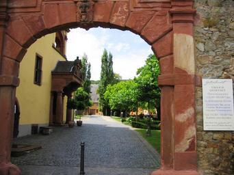 Keywords: SchlossVollradsWinkelTorSchlosshof.JPG de Blick durch das Tor von Schloss Vollrads bei Winkel im Rheingau in den Schlosshof own Brühl 2009-07-06 Schloss Vollrads