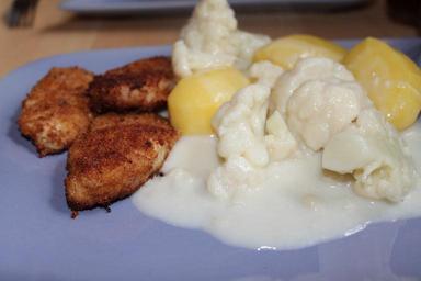 Keywords: schnitzel cauliflower vegetable cauliflower breaded meat potatoes eat cook court food