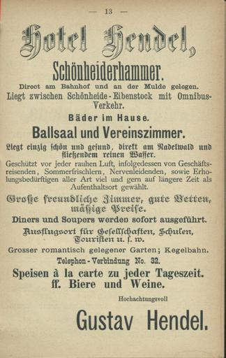 | Keywords: Schönheide im Erzgebirge Hotel Hendel 1894.jpg Schönheide im Erzgebirge Die Adressbücher für die Jahre 1894 und 1896 zu finden in der Category Historical documents of Schönheide haben eine Reihe von Anzeigen auch von Hotels und Gaststätten Dort finden sich 2015 noch bestehende Gaststätten wie die žGute Quelle der Familie Frieß und inzwischen unbekannte deren Standort kaum rekonstruierbar ist Eine reiche Gaststättenlandschaft die insbesondere im Veranstaltungsheft zur 400-Jahr-Feier des Jahres 1937 deutlich wird Ein Gasthof in Schönheiderhammer wird schon sehr früh in der Literatur erwähnt er gehörte zum Eisenhammer Das Hendel'sche Hotel brannte 1932 ab der Nachfolgebau bekam den Namen Hotel Carlshof Schönheide in the Ore Mountains Advertisements of hotels and restaurants in address books of 1894 and 1896 to find here Category Historical documents of Schönheide 1894 own Klaaschwotzer other versions pd-old Uploaded with UploadWizard Former hotels and restaurants of Schönheide |