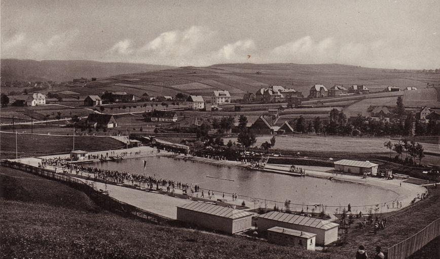 | Keywords: Schönheide im Erzgebirge Neuheide Schwimmbad.jpg Schönheide im Erzgebirge Das Gemeindebad Schönheides wurde in den 1920er/1930er Jahren in der damals noch selbständigen Nachbargemeinde Neuheide gebaut Das Wasser des Filzbachs speiste es es floß durch das Schwimmbad dessen Wasser dadurch nie von der Sonne erwärmt wurde ein Bad für Abgehärtete Das Schwimmbad war so konzipiert daß im Winter eine Eisfläche in einer Größe entstand die Eishockeyspiele des örtlichen Eishockeyvereins zuließ Die bei Spielen um die mit einer Bretterplanke von etwa einem Meter Höhe umgebenen Spielfläche Stehenden wärmten ihre Füße indem sie gegen die Bretterplanke schlugen - Anfeuerung der besonderen Art Füße- und herzerwärmend Die Natureisbahn wurde bis in die 1980er Jahre betrieben eine Beleuchtungsanlage ließ auch Spiele bei Dunkelheit zu Legendär ist die Schönheider Eishockeymannschaft der 1940er und 1950er Jahre die sogar in der DDR-Oberliga spielte - Im Hintergrund ist der Ortsteil Schwarzwinkel Schönheide zu sehen Die Bebauung aus den 1930er Jahren zieht sich an der Schneeberger Straße entlang die ebenfalls in dieser Zeit entstand Der unbewaldete Hügel im Hintergrund ist die Allee früher auch Oberförsterknock genannt 684 Meter hoch Dahinter wiederum liegt das Zentrum von Schönheide das sich im Tal des Dorfbachs entlang zieht Foto 1930er Jahre Klaaschwotzer 2014-08-03 History of Schönheide Neuheide Schwarzwinkel Schönheide Filzbach Schönheide Cc-zero |
