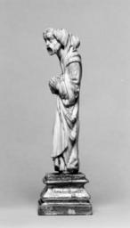 | Keywords: School of Giovanni Pisano - Apostle or Prophet - Walters 71245 - Three Quarter.jpg This unusual bearded figure stands bent forward head projecting at a forty-five-degree angle his hood falling back off his head He holds an open book which forms an X with the folds of drapery below The straight folds on the front of the figure contrast with the shaper V-folds at the sides Although the back is flat as if the figure were intended to be seen against a background it is carved with vertical folds The eyes are half closed the mouth is partially open The projecting head and open mouth the boldness of the concept and the contained emotion of the figure relate it to the works of Giovanni Pisano The unusual treatment of the waist with the decided break in the composition is a favorite device of Pisano and may be seen in his Justice figure in the Palazzo Bianco Genoa among others The half-closed eyes also appear in the Justice The treatment of the figure's right knee under the drapery is paralleled in Pisano's Pisa Cathedral pulpit the sharp drapery folds in his ivory Madonna in the Pisa Cathedral However the composition and treatment are weaker in the Walters figure and the date seems to be more toward the middle of the century The base has been cut above the feet and minor alterations made to the hemline of the garments The surface was partially cleaned at one time There is a wide hole in the top of the hood 1st half Other date century 14 Medieval ivory cm 13 9 accession number 71 245 21591 Octave Homberg Collection Paris date and mode of acquisition unknown Homberg Sale Paris May 16 1908 lot 493 Léon Gruel Paris date and mode of acquisition unknown Henry Walters Baltimore date of acquisition unknown by purchase Walters Art Museum Henry Walters Acquired by Henry Walters place of origin Italy Walters Art Museum license Medieval ivory in the Walters Art Museum Giovanni Pisano Media contributed by the Walters Art Museum needs category review Media contributed by the Walters Art Museum needs artist update |