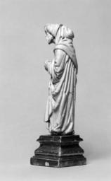 | Keywords: School of Giovanni Pisano - Apostle or Prophet - Walters 71245 - Left.jpg This unusual bearded figure stands bent forward head projecting at a forty-five-degree angle his hood falling back off his head He holds an open book which forms an X with the folds of drapery below The straight folds on the front of the figure contrast with the shaper V-folds at the sides Although the back is flat as if the figure were intended to be seen against a background it is carved with vertical folds The eyes are half closed the mouth is partially open The projecting head and open mouth the boldness of the concept and the contained emotion of the figure relate it to the works of Giovanni Pisano The unusual treatment of the waist with the decided break in the composition is a favorite device of Pisano and may be seen in his Justice figure in the Palazzo Bianco Genoa among others The half-closed eyes also appear in the Justice The treatment of the figure's right knee under the drapery is paralleled in Pisano's Pisa Cathedral pulpit the sharp drapery folds in his ivory Madonna in the Pisa Cathedral However the composition and treatment are weaker in the Walters figure and the date seems to be more toward the middle of the century The base has been cut above the feet and minor alterations made to the hemline of the garments The surface was partially cleaned at one time There is a wide hole in the top of the hood 1st half Other date century 14 Medieval ivory cm 13 9 accession number 71 245 21591 Octave Homberg Collection Paris date and mode of acquisition unknown Homberg Sale Paris May 16 1908 lot 493 Léon Gruel Paris date and mode of acquisition unknown Henry Walters Baltimore date of acquisition unknown by purchase Walters Art Museum Henry Walters Acquired by Henry Walters place of origin Italy Walters Art Museum license Medieval ivory in the Walters Art Museum Giovanni Pisano Media contributed by the Walters Art Museum needs category review Media contributed by the Walters Art Museum needs artist update |