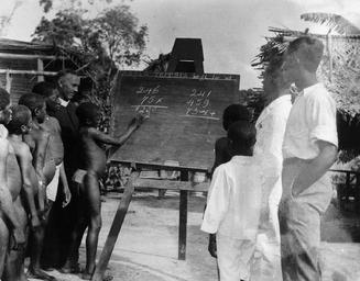 | Keywords: School Licieux van de Rooms-Katholieke Missie te Suriname - Collectie stichting Nationaal Museum van Wereldculturen - TM-10018886.jpg Photograph Creator Unknown Katholieke priesters leren marrons kinderen lezen schrijven en rekenen in de buitenlucht Aan de boven kant van het schoolbord staat Santa Teresia begi foe wi Dit betekent Heilige Teresia bidt voor ons Religie Rooms-katholiek Cultuur Boslandcreolen Bosnegers Europees Marrons Onderwerp aanschouwelijk maken explicatie overdracht dorpsscholen hutjes hutten lendendoeken lendenschorten missie schoolborden schorten bovenkleding voor onderlijf visualiseren Subject cabins huts loincloths one-room schools visualization explanation explication depicted place SUR Suriname 1943 droge gelatineplaat droge plaatnegatieven fotografische gelatine fotografische procédés gelatine glasplaatnegatieven gelatine-negatieven op glas gelatineplaatnegatieven glas materiaal gelatin dry plate negatives glass material photographic gelatin photographic processes 9 x 12cm 3 9/16 x 4 3/4in accession number TM-10018886 297299 Expedition Wikipedia KIT-license Anonymous-EU Files from the Nationaal Museum van Wereldculturen Christian mission in Suriname |