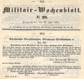 | Keywords: Schuetzenabz1850.jpg en prussain military commander decree journal from 1850 for the infantry shooting-insignia de Preussische Armeeverordnung von 1850 zum Schützenabzeichen der Infanterie Militair-Wochenblatt Nr 29 Author 1850-07-20 Military of the German Empire PD-old |