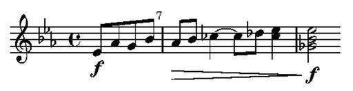 | Keywords: Schumann-3m4-interlude.png Interlude of the fourth movement in Schumann's symphony no 3 bars 6-8 Own 2007-10-16 Thomas Schultz music by Robert Schumann who died more than 70 years ago; engraving is own work and hereby released into the public domain musical notation LilyPond source \version 2 10 13 \include deutsch ly \layout indent 0 line-width 150 ragged-last t << \set Score currentBarNumber 7 \relative \new Staff \time 4/4 \key es \major \bar \partial 2 es8\f as g b \once\override Score BarNumber 'break-visibility end-of-line-invisible as\> b ces4 ~ ces8 des <es ces>4 <es b ges>2\f >> Sheet music of Robert Schumann |
