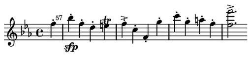 | Keywords: Schumann-3m5-sidetheme.png Side theme of the fifth movement in Schumann's symphony no 3 bars 57 ff Own 2008-05-01 Thomas Schultz music by Robert Schumann who died more than 70 years ago; engraving is own work and hereby released into the public domain musical notation LilyPond source \version 2 10 17 \include deutsch ly \layout indent 0 line-width 150 ragged-last t << \set Score currentBarNumber 57 \relative \new Staff \time 4/4 \key es \major \partial 4 f'4- \once\override Score BarNumber 'break-visibility end-of-line-invisible b- \sfp f- d- e\trill f->- c- f - g'- c- g- a- f- <f f'>2 -> >> Sheet music of Robert Schumann |