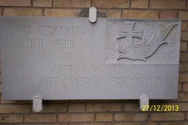 | Keywords: Schwartau Regina Caeli 2306.JPG Die Kirche Maria Königin auch Marienkirche oder Regina Caeli in der Geibelstraße Bad Schwartau Gedenktafel an der an der Außenwand links The Queen of Heaven Church aka Mary Church or Regina Caeli in the Geibelstraße Bad Schwartau Schleswig-Holstein Germany Memorial plaque own 2013-12-27 Ulf Heinsohn my own work timestamp Kirche Maria Königin Bad Schwartau Plaques in Kreis Ostholstein Bad Schwartau Marienkirche Monuments and memorials to Heimatvertriebene in Schleswig-Holstein BadSchwartau War memorials in Schleswig-Holstein Bad Schwartau Marienkirche Monuments and memorials to victims of National Socialism in Schleswig-Holstein Bad Schwartau Marienkirche Monuments and memorials in Bad Schwartau Tote Krieg Vertreibung Gewalt |