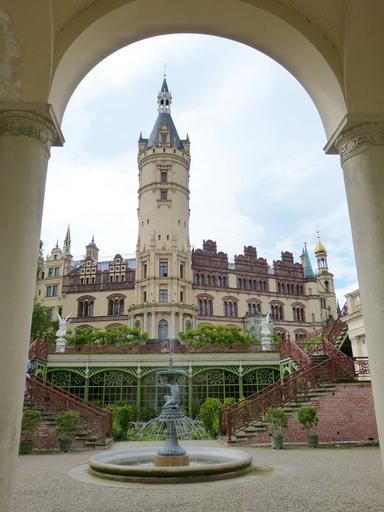 Keywords: schwerin mecklenburg western pomerania seat of government state capital castle architecture places of interest building historically tower castle park arch fountain garden statue