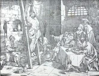 | Keywords: Schybi auf der Folter02.jpg Swiss peasant war of 1653 is tortured and interrogated at Sursee where he was beheaded on July 9 1653 Gregorian calendar This 19th century engraving depicts Schybi in an allegory on the crucified Christ 2013-05-25 16 14 30 Immediate image source Holenstein A http //www stub unibe ch/extern/hv/1_04/holenstein pdf Der Bauernkrieg von 1653 Ursachen Verlauf und Folgen einer gescheiterten Revolution; in Berner Zeitschrift für Geschichte und Heimatkunde no 66 pp 1 43; 2004 Martin Disteli Custom license marker 2013 05 25 PD-old Christian Schybi Uploaded with UploadWizard Swiss peasant war of 1653 Torture in art Torture chamber Works by Martin Disteli |