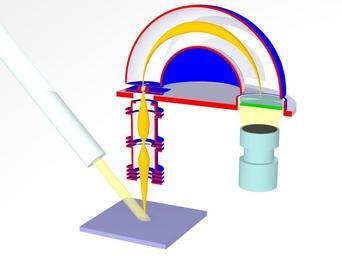 | Keywords: Scienta5.jpg Created with Persistence of Vision en revisited work of File PES1 jpg with better light smoother electron path and less shadows Own Saiht 2009-06-15 POVray script <pre> // Schnitt durch ein PhotoelectronSpetroskopie Experiment // by Matthias Kreier version 0 8; global_settings assumed_gamma 1 0 default finish ambient 0 6 diffuse 0 4 include colors inc include textures inc camera ultra_wide_angle angle 25 location <35 30 -65> look_at <3 10 0> //plane <0 1 0> -1 pigment color Red //plane <0 0 -1> -50 pigment color White plane <0 1 -1> -2000 pigment color LightGray // Linsensystem zur Fokussierung und Retardierung declare Linsensystem union difference union box <-2 1 3 0 -2 1> <2 1 3 2 2 1> box <-2 1 3 4 -2 1> <2 1 3 6 2 1> box <-2 1 3 8 -2 1> <2 1 4 0 2 1> box <-2 1 6 8 -2 1> <2 1 7 0 2 1> pigment color Blue cylinder < 0 2 9 0 > <0 7 1 0> 0 81 pigment color Silver cylinder < 0 2 9 0 > <0 7 1 0> 2 pigment color Silver inverse difference union cylinder < 0 4 2 0 > <0 4 4 0> 2 1 cylinder < 0 4 3 0 > <0 6 5 0> 1 4 cylinder < 0 6 4 0 > <0 6 6 0> 2 1 cylinder < 0 7 2 0 > <0 7 4 0> 2 1 cylinder < 0 7 3 0 > <0 9 9 0> 1 4 cylinder < 0 9 8 0 > <0 10 0> 2 1 cylinder < 0 10 2 0 > <0 10 4 0> 2 1 cylinder < 0 10 3 0 > <0 11 2 0> 1 4 cylinder < 0 4 1 0 > <0 11 0> 1 2 pigment color Silver cylinder < 0 10 9 0 > <0 11 3 0> 0 8 pigment color Silver cylinder < 0 4 1 0 > <0 11 3 0> 2 pigment color Silver inverse translate <0 1 0> declare Kugelanalysator union intersection // innere Kugel difference sphere <6 14 0> 4 2 texture Polished_Chrome sphere <6 14 0> 4 pigment color Blue box <1 14 -1> <11 19 5> pigment color Red intersection // äußere Kugel difference sphere <6 14 0> 8 pigment color Blue sphere <6 14 0> 7 8 pigment color Silver box <-3 14 -1> <15 23 9> pigment color Red difference // Herzog-Platte cylinder < 6 12 5 0 > < 6 13 0 > 9 pigment color LightSteelBlue cylinder < 0 12 4 0> <0 13 1 0> 1 1 pigment color Silver cylinder < 12 12 4 0> <12 13 1 0> 2 3 difference cylinder < 12 12 5 0 > < 12 13 8 0 > 2 4 pigment color Blue cylinder < 12 12 4 0> < 12 13 9 0> 2 2 pigment color Silver intersection // Eingangsspalte union box <-2 13 25 -2> <2 13 35 2> pigment color Blue box <-0 6 13 3 -2> <0 6 13 75 2> pigment color Blue box <-0 2 13 2 -2 1> <0 2 14 1 2 1> pigment color Silver inverse intersection // Eingangsblenden union cylinder < 0 13 85 0 > < 0 13 9 0 > 2 pigment color Blue cylinder < 0 13 1 0 > < 0 13 15 0 > 2 pigment color Blue box <-0 15 13 0 -1> <0 15 14 1 1> pigment color Silver inverse declare Optik union object Linsensystem pigment color Blue object Kugelanalysator rotate<0 0 0> declare Scienta union intersection // Linsensystem und Analysator entlang x aufgeschnitten object Optik box <-3 2 0> <15 23 9> pigment color Red intersection //aufgeschnitten union cylinder <12 13 3 0> <12 13 8 0> 2 pigment color CadetBlue // Channelplate cylinder <12 13 0 0> <12 13 2 0> 2 pigment color Green // Phosphorplatte box <9 10 0> <15 15 9> pigment color rgbf <1 1 1 1> difference // CCD Kamera cylinder <12 9 5 0> <12 11 0> 1 8 pigment color CadetBlue cylinder <12 10 0> <12 11 1 0> 1 6 pigment color Black cylinder <12 9 6 0> <12 8 0> 1 4 pigment color CadetBlue cylinder <12 8 1 0> <12 5 5 0> 1 8 pigment color CadetBlue cone <12 11 0> 1 6 <12 12 95 0> 2 texture pigment rgbf<1 1 0 7 0 97> // Weg der Elektronen declare Elektron1 union intersection // Normales Elektron Passenergie intersection torus 6 0 5 rotate<-3 8 0 0> translate <0 0 46 0> torus 6 0 5 rotate< 3 8 0 0> translate <0 -0 46 0> torus 6 0 7 translate <-0 67 0 0> torus 6 0 7 translate < 0 67 0 0> rotate<90 0 0> translate<6 14 0> box <-2 14 -2> <13 23 2> / intersection // Energie kleiner als Epass intersection torus 6 0 5 rotate<-3 8 0 0> translate <0 0 46 0> torus 6 0 5 rotate< 3 8 0 0> translate <0 -0 46 0> torus 6 0 7 translate <-0 67 0 0> torus 6 0 7 translate < 0 67 0 0> rotate<90 0 0> scale 0 9 translate<5 4 14 0> box <-2 14 -2> <13 23 2> intersection // Energie größer als Epass intersection torus 6 0 5 rotate<-3 8 0 0> translate <0 0 46 0> torus 6 0 5 rotate< 3 8 0 0> translate <0 -0 46 0> torus 6 0 7 translate <-0 67 0 0> torus 6 0 7 translate < 0 67 0 0> rotate<90 0 0> scale 1 1 translate<6 6 14 0> box <-2 14 -2> <15 23 2> / cone < 0 0 0 > 0 <0 5 5 0> 0 5 cone < 0 5 5 0 > 0 5 <0 6 0 0> 0 57 cone < 0 6 0 0 > 0 57 <0 6 4 0> 0 57 cone < 0 6 4 0 > 0 57 <0 7 0> 0 45 cone < 0 7 0 > 0 45 <0 8 2 0> 0 03 cone < 0 8 0 > 0 03 <0 9 0> 0 5 cone < 0 9 0 > 0 5 <0 10 0> 0 6 cone < 0 10 0 > 0 6 <0 11 0> 0 5 cone < 0 11 0 > 0 5 <0 13 5> 0 02 cone < 0 13 5 0> 0 02 <0 14 0> 0 05 // cone < 0 11 0 > 0 2 <0 14 1 0> 0 05 // cylinder < 0 5 0 > <0 11 0> 0 2 // cone < 0 0 0 > 0 <0 5 0> 0 2 declare Lichtquelle union cylinder <-18 18 0> <1 -1 0> 0 5 texture pigment rgbf<1 1 0 6 0 7> difference cylinder <-5 5 5 5 0> <-40 40 0> 1 2 cylinder <-5 4 5 4 0> <-20 20 0> 0 5 pigment color LightBlue declare Sample union box <-4 8 -0 5 -4 8> <4 8 0 4 8> pigment color RichBlue cylinder < 0 -1 0 > < 0 -2 0> 1 pigment color Green // alles zusammenbauen object Scienta object Elektron1 pigment color Orange object Lichtquelle object Sample // Lichtquellen light_source <12 18 -200> color White light_source // <0 26 -20> <35 30 -65> color White light_source // Rückseite beleuchten <20 30 10> color White / light_source <-60 28 -200> color White light_source // <0 26 -20> // <30 30 -45> <20 30 -65> color White light_source <20 30 10> color White // Rückseite beleuchten light_source // Kugel innen Licht <9 21 1 5> color White / </pre> Photoemission spectroscopy |