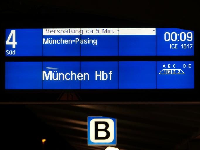 Keywords: scoreboard railway station overhead projector information sign departure times arrival times train railway platform departure time digital display clock rail traffic blue bright