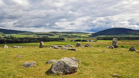 Keywords: scotland aberdeenshire dee-tal stone circle old historically mystical sky clouds meadow landscape