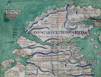Keywords: Scotland from the Matthew Paris map, c.1250.jpg page at Commons 2011-08-30 British Library Creator Matthew Paris PD-old-100 ImageNote 2 255 208 55 49 522 399 2 Stirling Bridge ImageNoteEnd 2 reads Wall separating the Scots and Picts of old ImageNoteEnd 3 ImageNote 6 69 250 75 37 522 399 2 Galloway orientated east-west rather than north-south ImageNoteEnd 6 ImageNote 7 79 300 32 18 522 399 2 Isle of Man ImageNoteEnd 7 ImageNote 8 3 306 65 42 522 399 2 Anglesay ImageNoteEnd 8 ImageNote 10 477 102 44 37 522 399 2 Orkney Islands shown off the east coast of Scotland rather than the north coast ImageNoteEnd 10 ImageNote 11 375 252 35 28 522 399 2 Edinburgh ImageNoteEnd 11 ImageNote 12 20 359 49 29 522 399 2 Snowdon ImageNoteEnd 12 ImageNote 13 165 130 55 19 522 399 2 Dumbarton ImageNoteEnd 13 ImageNote 14 411 86 43 16 522 399 2 Dundee ImageNoteEnd 14 ImageNote 16 410 122 57 23 522 399 2 St Andrews ImageNoteEnd 16 ImageNote 17 320 196 49 22 522 399 2 Dunfermline ImageNoteEnd 17 ImageNote 18 215 109 45 20 522 399 2 Dunkeld ImageNoteEnd 18 states A country marshy and impassable fit for cattle and shepherds ImageNoteEnd 19 ImageNote 20 185 268 65 18 522 399 2 River Clyde ImageNoteEnd 20 ImageNote 21 322 272 43 18 522 399 2 Glasgow located on the River Clyde but too far eastwards ImageNoteEnd 21 ImageNote 22 399 295 44 18 522 399 2 Berwick ImageNoteEnd 22 ImageNote 23 315 230 32 24 522 399 2 Queensferry ImageNoteEnd 23 ImageNote 24 135 346 35 25 522 399 2 Carlisle ImageNoteEnd 24 states A maritime district and a race of mountain people ImageNoteEnd 25 ImageNote 26 268 76 61 68 522 399 2 A mountainous and wooded region producing a people rude and pastoral by reason of marshes and fens ImageNoteEnd 26 ImageNote 27 62 145 31 48 522 399 2 Island of Columkille i e Columba hence Iona ImageNoteEnd 27 ImageNote 28 22 212 55 19 522 399 2 Island of Tyree ImageNoteEnd 28 ImageNote 29 28 47 73 49 522 399 2 A boundless and trackless sea ImageNoteEnd 29 ImageNote 30 349 4 34 21 522 399 2 Isle of May positioned off the wrong coast The island is actually located off the east coast at the mouth of the Firth of Forth ImageNoteEnd 30 ImageNote 32 430 44 70 15 522 399 2 Arbroath positioned on the wrong coast ImageNoteEnd 32 ImageNote 33 379 42 41 15 522 399 2 Aberdeen positioned on the wrong coast ImageNoteEnd 33 ImageNote 34 352 41 25 43 522 399 2 Caithness ImageNoteEnd 34 ImageNote 35 405 62 105 15 522 399 2 Sutherland ImageNoteEnd 35 ImageNote 36 350 97 55 19 522 399 2 An arm of the sea presumably the Moray Firth ImageNoteEnd 36 ImageNote 37 79 326 40 24 522 399 2 North Wales ImageNoteEnd 37 ImageNote 39 173 256 102 13 522 399 2 River making Clydesdale ImageNoteEnd 39 ImageNote 40 356 227 35 24 522 399 2 Earlsferry meaning the earl's ferry at North Berwick not to be confused with Earlsferry on the Fife coast opposite The ferry connected these two locations to assist pilgrims from the south journeying to St Andrews ImageNoteEnd 40 ImageNote 41 376 282 46 12 522 399 2 Tweeddale ImageNoteEnd 41 reads Wall separating the Angles and Picts of old ImageNoteEnd 42 ImageNote 43 275 327 32 16 522 399 2 Melrose ImageNoteEnd 43 ImageNote 44 310 324 23 20 522 399 2 Roxburgh ImageNoteEnd 44 ImageNote 45 419 369 65 15 522 399 2 Cheviot Hills ImageNoteEnd 45 ImageNote 46 465 305 35 32 522 399 2 Lindisfarne ImageNoteEnd 46 ImageNote 47 169 154 284 43 522 399 2 SCOTLAND BEYOND THE SEA This is also called Albany ImageNoteEnd 47 Uploaded with UploadWizard Matthew Paris Abbreuiatio chronicorum AD 1000 “1255 13th C - BL Cotton MS Claudius D VI 012vd Maps by Matthew Paris Britain D1 1250s maps Old maps of Scotland 1250 History of Scotland