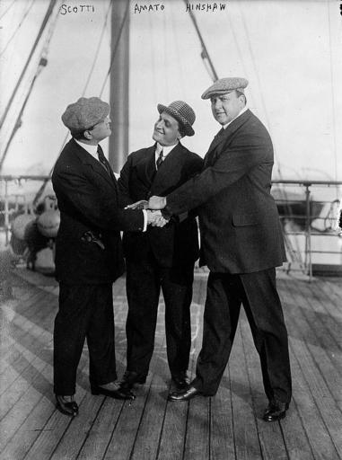 | Keywords: Scotti 2422671709 c67c6163ea o.jpg en wikipedia 2012 January 10 Bain News Service publisher Antonio Scotti Pasquale Amato and William Hinshaw aboard the SS George Washington on October 29 1912 The steamship George Washington brought in several important additions to the operatic forces in America yesterday Its passenger list included the names of Titta Ruffo the 2 000 baritone and Lucrezia Bori the Spanish soprano Besides Ruffo there were three other baritones on board -- Antonio Scotti Pasquale Amato and William Hinshaw 1912 1 negative glass ; 5 x 7 in or smaller Notes Title from unverified data provided by the Bain News Service on the negatives or caption cards Photo probably shows three opera singers baritones Antonio Scotti Pasquale Amato and William Hinshaw who arrived in New York City aboard the steamship George Washington in 1912 to perform with the Metropolitan Opera Company Source Flickr Commons project 2008 Forms part of George Grantham Bain Collection Library of Congress Format Glass negatives Rights Info No known restrictions on publication Repository Library of Congress Prints and Photographs Division Washington D C 20540 USA hdl loc gov/loc pnp/pp print General information about the Bain Collection is available at hdl loc gov/loc pnp/pp ggbain Persistent URL hdl loc gov/loc pnp/ggbain 10934 Call Number LC-B2- 2455-11 ggbain 10934 en wikipedia 2009-12-21 Richard Arthur Norton 1958- wikipedia en PD-Bain Original upload log page en wikipedia Scotti_2422671709_c67c6163ea_o jpg 2009-12-21 10 24 Richard Arthur Norton 1958- 742×1024× 130719 bytes <nowiki> PD-US Bain News Service publisher Antonio Scotti Pasquale Amato and William Hinshaw on October 29 1912 1912 1 negative glass ; 5 x 7 in or smaller Notes Title from unverified data provided by the Bain News Service on the </nowiki> Antonio Scotti Pasquale Amato |