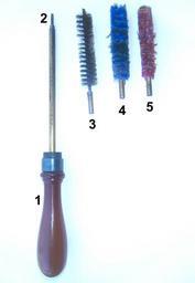 | Keywords: Scovoli.jpg en Gun-barrel brush 1 handle; 2 screw; 3 brush for cleaning; 4 and 5 Brushes for cleaning and lubricate the barrel it Scovoli per canne di armi 1 manico; 2 vite di fissaggio per gli scovoli; 3 scovolo per pulire; 4 e scovoli per oliare la canna own Ricce Brushes |