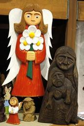 Keywords: sculpture wood carving face girl flowers color red wood popular manual work the art of świątki