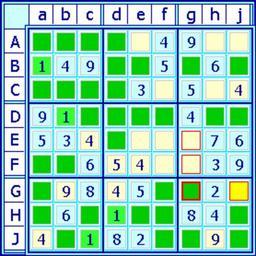 | Keywords: Sdk ex03A3.gif Exemple de sudoku avec élimination indirecte étape c <br><br> <FONT SIZE 1 >Sur cette image on a entouré en rouge les 2 cases vides</FONT> <FONT color red size 1>Eg</FONT> <FONT SIZE 1>et</FONT> <FONT color red size 1>Fg</FONT> <FONT size 1>du pavé </FONT><FONT color 666666 size 1>Yz</FONT> <FONT size 1>qui permettent d'étendre les suppressions à la case </FONT><FONT color red size 1>Gg</FONT><FONT size 1> et l'on constate alors que dans le pavé </FONT><FONT color red size 1>Zz</FONT><FONT size 1> ou encore sur la ligne </FONT><FONT color red size 1>G</FONT><FONT size 1> seule la case </FONT><FONT color red size 1>Gj</FONT><FONT size 1> en jaune reste libre elle seule peut donc recevoir la valeur </FONT><FONT color red size 1>1</FONT><FONT size 1> </FONT> <FONT SIZE 1 > voir l'image de l'étape d Image Sdk ex03A4 gif </FONT><FONT SIZE 1 > </FONT><br><br> Les étapes antérieures b et c et l'étape postérieure d correspondent aux images Image Sdk ex03A1 gif Image Sdk ex03A2 gif et Image Sdk ex03A4 gif <br> <br> Pour voir d'autres exemples analogues élimination indirecte cliquer ici Image Sdk ex03B gif et Image Sdk ex03C1 gif <br><br> Voir l'article Résolution d'un sudoku http //fr wikipedia org/wiki/Résolution_d'un_sudoku sur Wikipédia own Papy77 Sudoku |