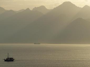 Keywords: sea abendstimmung horizon mountains sunset clouds sky mediterranean back light silhouette shadow