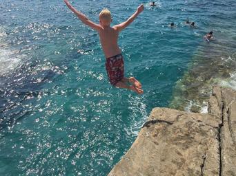 Keywords: sea cliff boy jump greece coast rock water high freedom fly blond courage blue