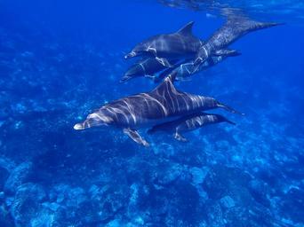 Keywords: sea dolphin blue in water diving animal people swimming together