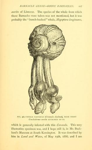 | Keywords: Sea fables explained (14966854294).jpg BARNACLE GEESE GOOSE BARNACLES <br> 117 <br> aurita of Linnaeus The species of the whale from which <br> these Barnacles were taken was not mentioned but it was <br> probably the hunch-backed whale Megaptera longimana <br> FIG 40 WHALE BARNACLE Corouiila diadcma WITH THREE <br> Co7ichoderma aiiHta attached to it <br> which is generally infested with this Coroniila This very <br> illustrative specimen was and I hope still is in Mr Buck- <br> land's Museum at South Kensington It was described by <br> him in Land and Water of May 19th 1866 and I am 10985723 41337 10456 Page 117 Text http //www biodiversitylibrary org/page/10985723 1883 10 5962/bhl title 10456 International Fisheries Exhibition; Lee Henry NameFound Barnacles NameConfirmed Barnacles NameBankID 5033555 NameFound Corouiila diadcma NameFound Megaptera longimana NameConfirmed Megaptera longimana Rudolphi 1832 EOLID 328575 Biodiversity Heritage Library Sea fables explained Folklore Ocean Smithsonian Libraries bhl page 10985723 dc identifier http //biodiversitylibrary org/page/10985723 bhlMonstersRreal Halloween smithsonian libraries bhlmonstersrreal halloween Information field Flickr posted date ISOdate 2014-10-21 CC-BY-2 0 BioDivLibrary https //flickr com/photos/61021753 N02/14966854294 2015-08-25 17 01 07 cc-by-2 0 PD-old-70-1923 Sea fables explained Photos uploaded from Flickr by FĂŚ using a script |