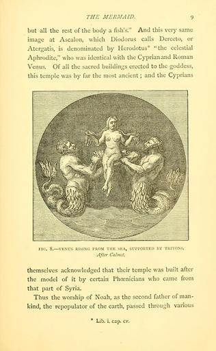 | Keywords: Sea fables explained (15401561997).jpg THE MERMAID 9 <br> but all the rest of the body a fish's And this very same <br> image at Ascalon which Diodorus calls Derceto or <br> Atergatis is denominated by Herodotus the celestial <br> Aphrodite who was identical with the Cyprian and Roman <br> Venus Of all the sacred buildings erected to the goddess <br> this temple was by far the most ancient ; and the Cyprians <br> FIG 8 ” VENUS RISING FROM THE SEA SUPPORTED BY TRITONS <br> After Calvict <br> themselves acknowledged that their temple was built after <br> the model of it by certain Phoenicians who came from <br> that part of Syria <br> Thus the worship of Noah as the second father of man- <br> kind the repopulator of the earth passed through various <br> Lib i cap cv 10985630 41337 10456 Page 9 Text http //www biodiversitylibrary org/page/10985630 1883 10 5962/bhl title 10456 International Fisheries Exhibition; Lee Henry NameFound Atergatis NameConfirmed Atergatis EOLID 102128 NameBankID 530454 NameFound Diodorus NameFound Herodotus Biodiversity Heritage Library Sea fables explained Mermaids Monsters Are Real Folklore Ocean Smithsonian Libraries bhl page 10985630 dc identifier http //biodiversitylibrary org/page/10985630 bhlMonstersRreal Halloween mermaid smithsonian libraries bhlmonstersrreal halloween Information field Flickr posted date ISOdate 2014-10-21 CC-BY-2 0 BioDivLibrary https //flickr com/photos/61021753 N02/15401561997 2015-08-25 17 58 15 cc-by-2 0 PD-old-70-1923 Sea fables explained Photos uploaded from Flickr by Fæ using a script |